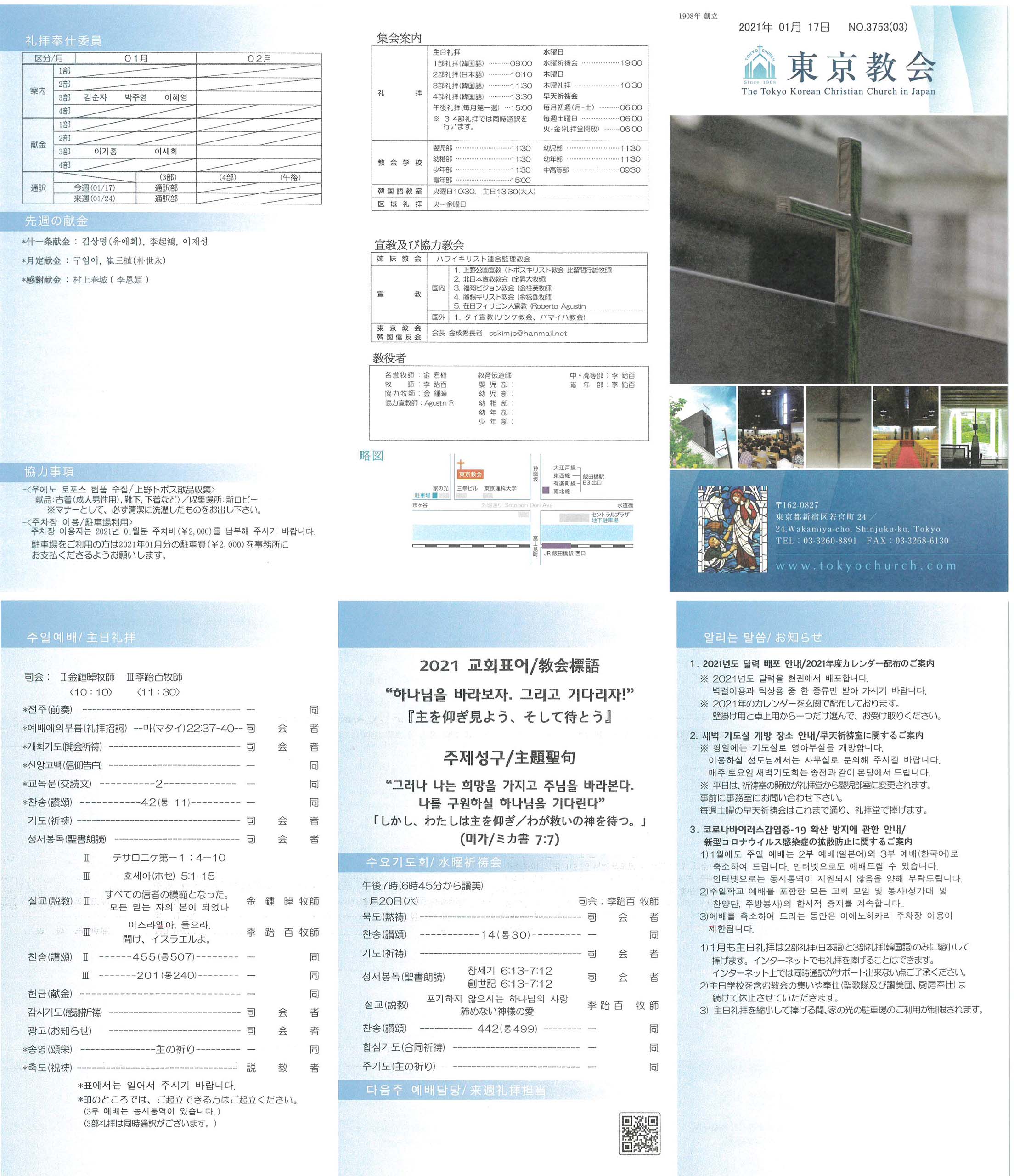 1)1月も主日礼拝は2部礼拝(日本語)と3部礼拝(韓国語)のみに縮小して