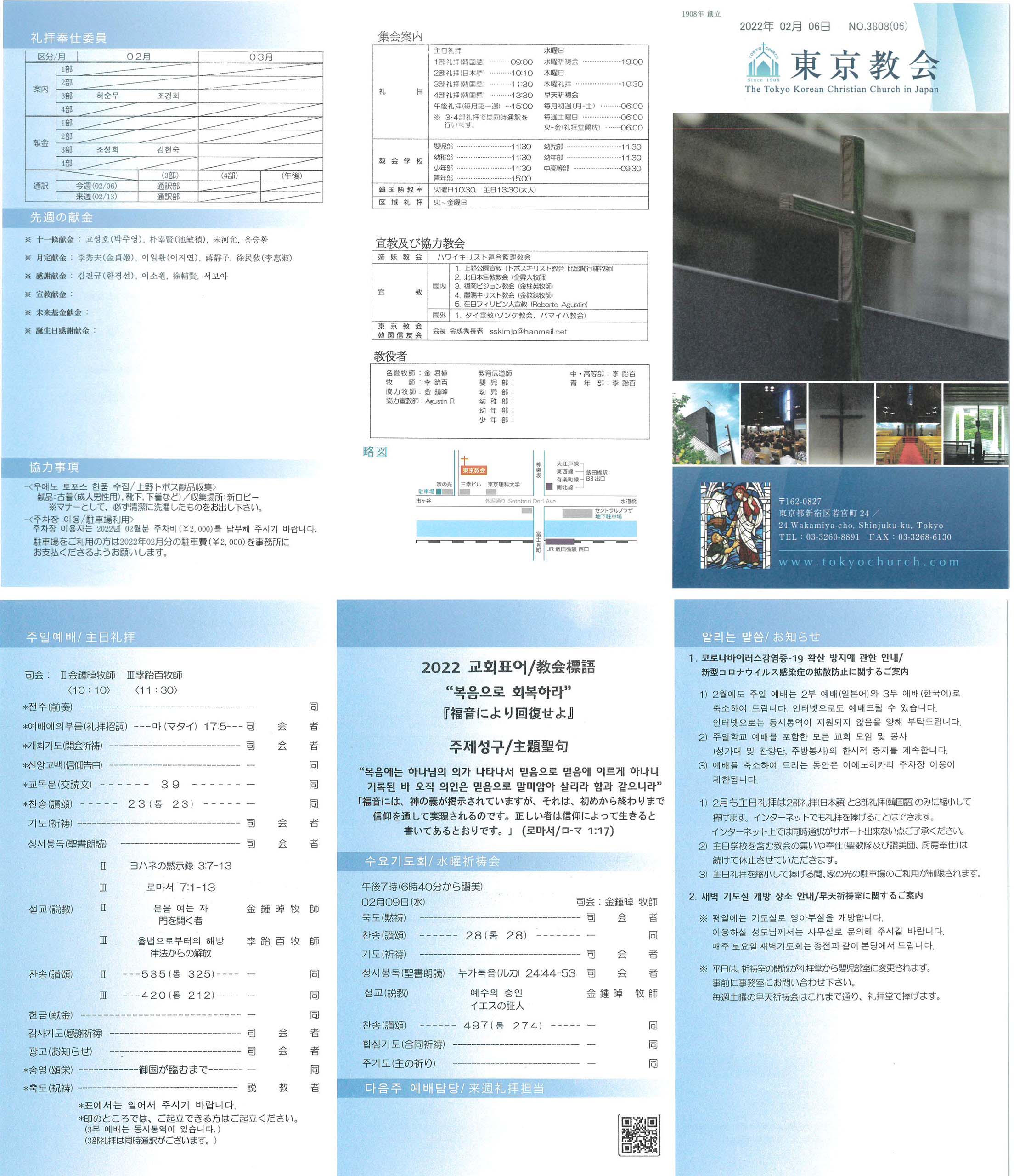 1) 2月も主日礼拝は2部礼拝(日本語)と3部礼拝(韓国語)のみに縮小して捧げます。インターネットでも礼拝を捧げることはできます。