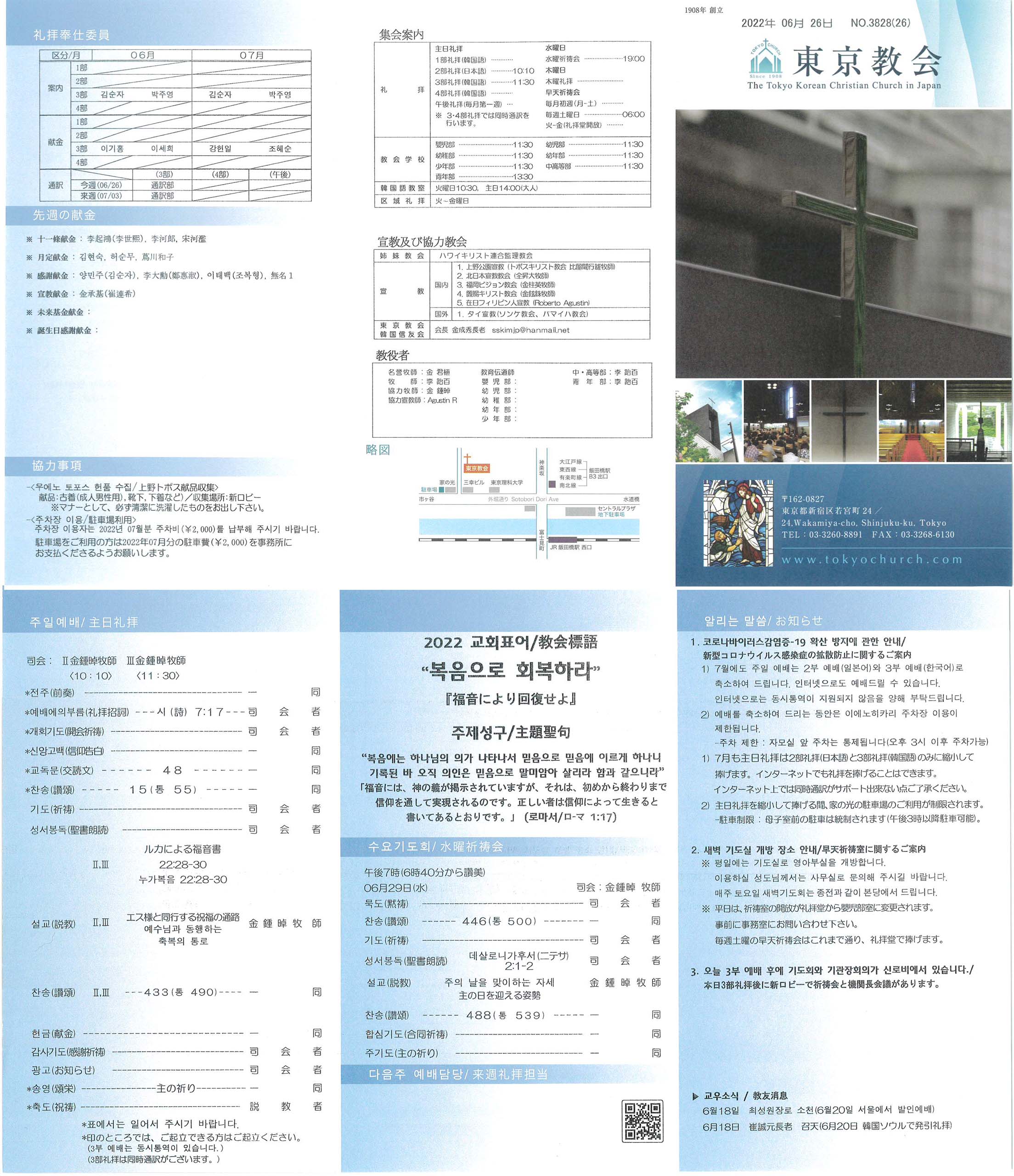 1) 7月も主日礼拝は2部礼拝(日本語)と3部礼拝(韓国語)のみに縮小して捧げます。インターネットでも礼拝を捧げることはできます。