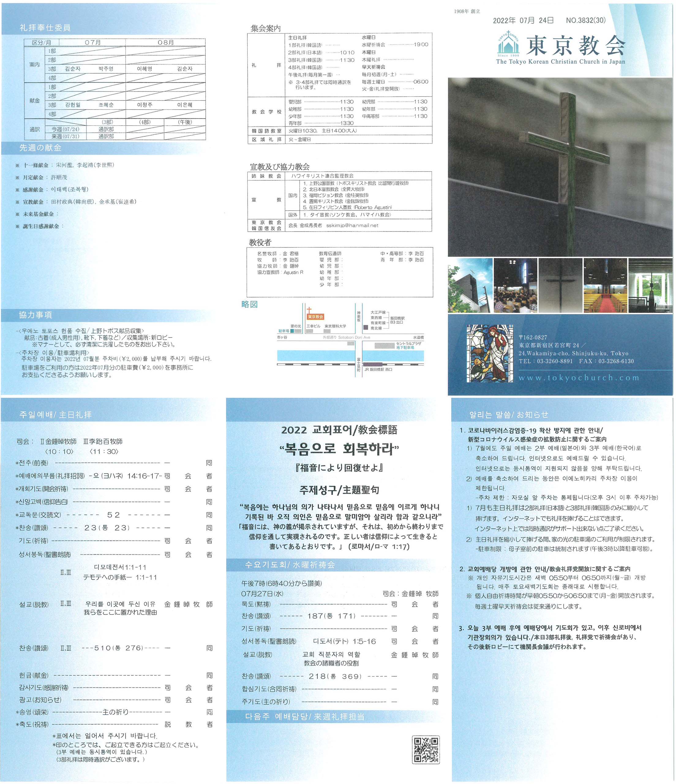 1) 7月も主日礼拝は2部礼拝(日本語)と3部礼拝(韓国語)のみに縮小して捧げます。インターネットでも礼拝を捧げることはできます。