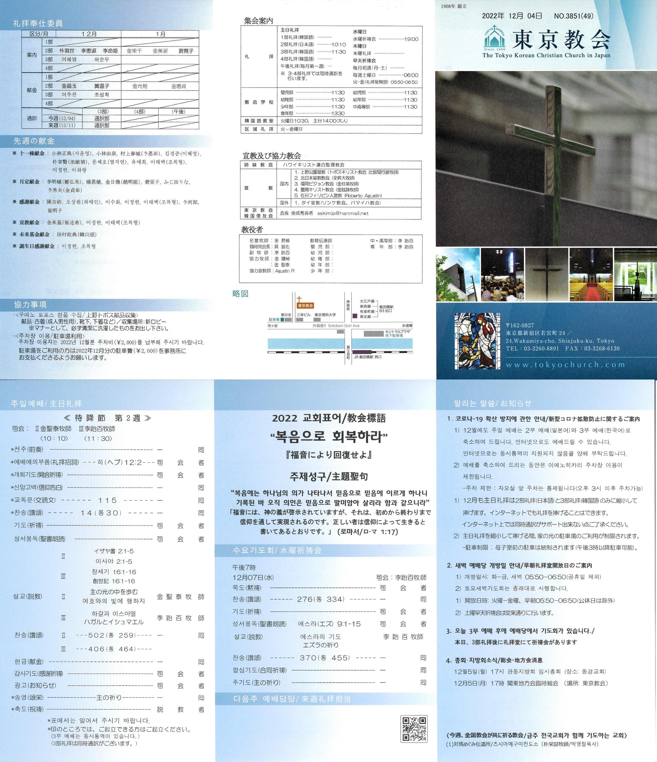 1) 12月も主日礼拝は2部礼拝(日本語)と3部礼拝(韓国語)のみに縮小して捧げます。インターネットでも礼拝を捧げることはできます。インターネット上では同時通訳がサポート出来ない点ご了承ください。