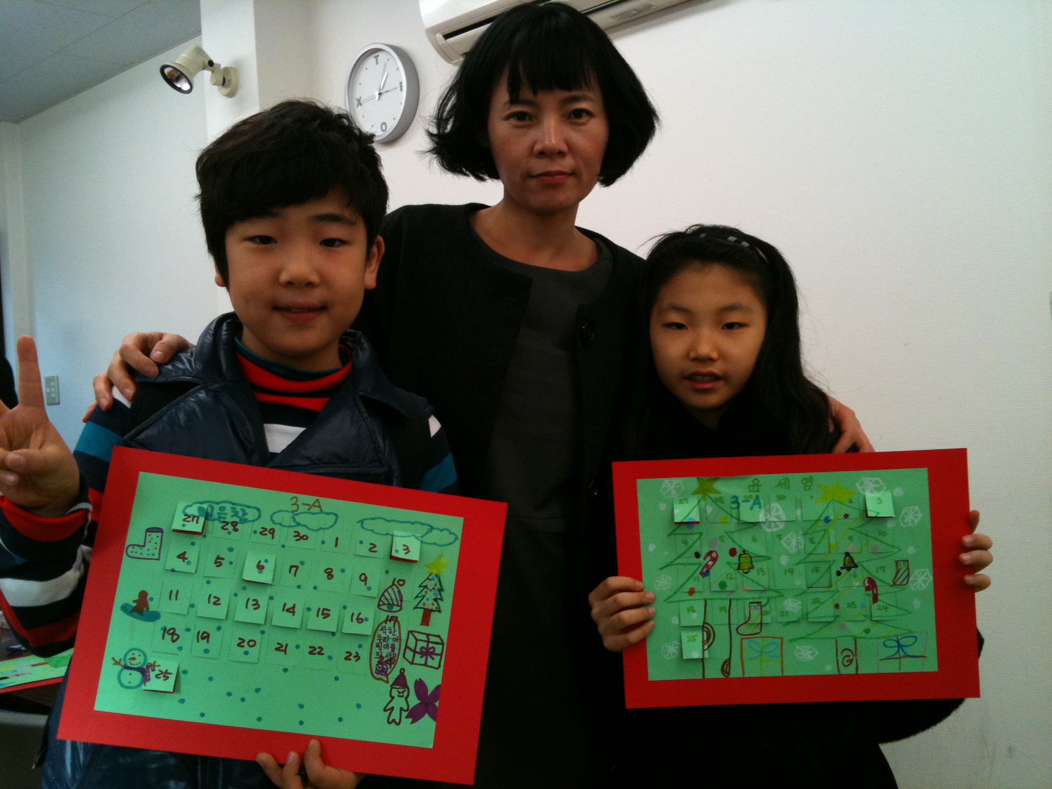 우리 어린이들의 선물을 산타 할아버지가 갖고 오시는 그림을 그린 은찬이와 멋진 크리스마스 트리를 그린 세영이.