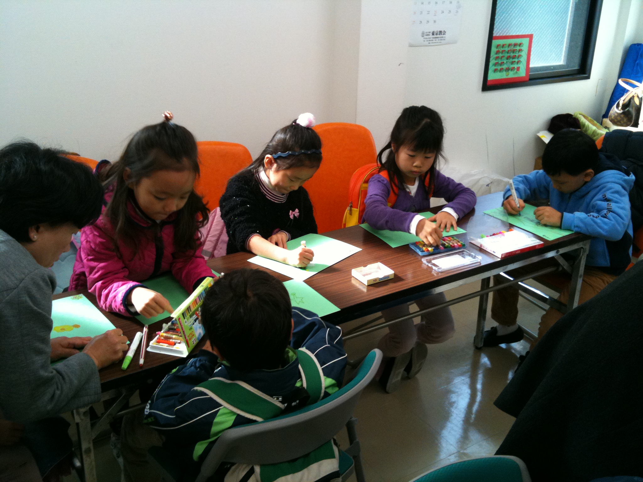 열심히 달력의 그림을 그리는 1학년 B반친구들과 이혜영 선생님.