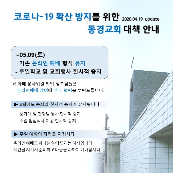 5. 5월 10일 이후의 예배 정상화 여부와 관련해서는, 추후 공지드리겠습니다.