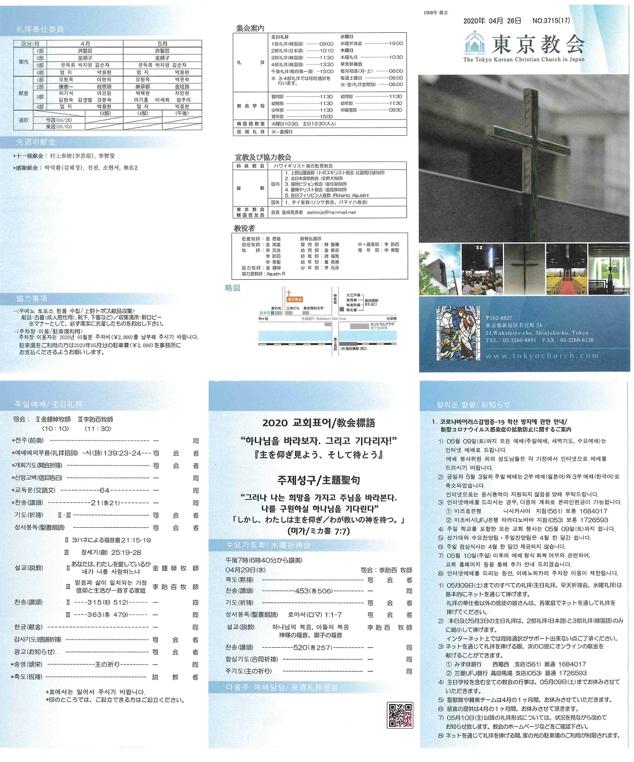 2) 금일과 5월 3일의 주일 예배는 2부 예배(일본어)와 3부 예배(한국어)로 축소되었습니다.