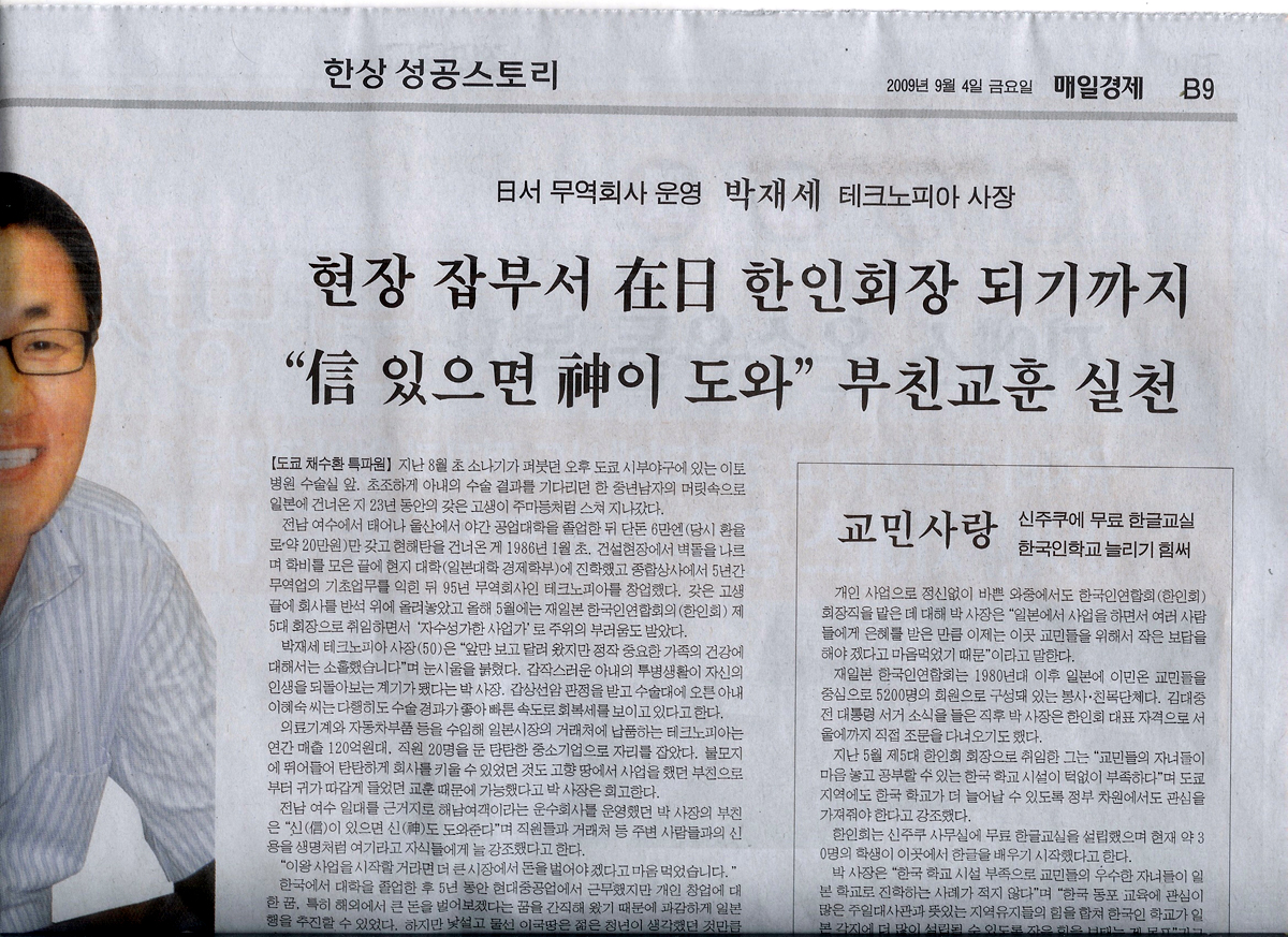 우리 동경교회의 박재세 장로님에 대한 기사가 9월 4일자 매일경제신문 B9 면에 전면기사로 게재되었기에 축하드리며, 관련 내용을 올려 드립니다.