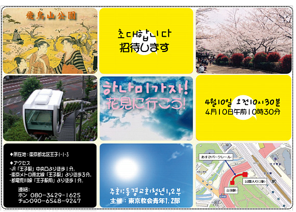이번 하나미는 돗자리 깔고 앉아서 도시락만 까먹고 오는게 아니라, 음악과 율동과 게임이 함께하는 다이내믹한 하나미를 계획하고 있습니다. 예를 들면 초등시절 봄소풍정도가 되겠네요. 그래서 이번 하나미 장소를 심사 숙고 끝에 신쥬쿠교엔을 포기하고 飛鳥山公園로 정했구요. 혹, 난 죽어도 신쥬쿠교엔으로 꼭 가봐야겠다 하는 분들...(윤의정 자매 등^^) 한달만 참으세요. 전교인 야외예배때 신쥬쿠교엔가니까요~물론 벛꼿은 잎사귀만 남겠지만...;;