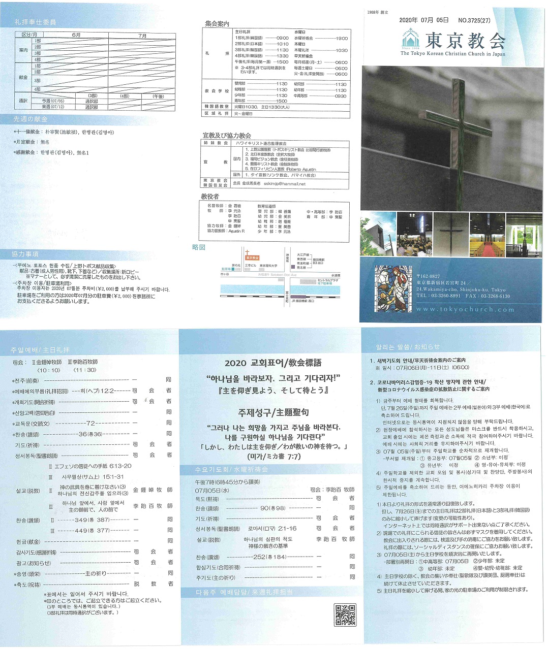단, 7월 26일(주일)까지 주일 예배는 2부 예배(일본어)와 3부 예배(한국어)로 축소하여 드립니다.
