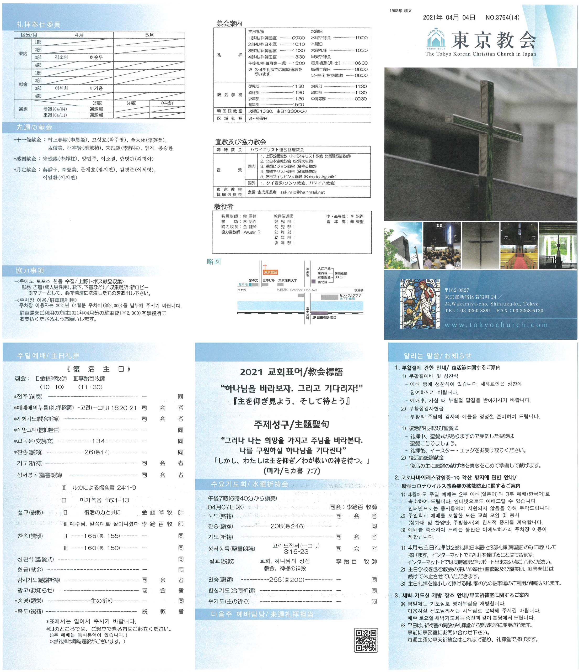 1) 4월에도 주일 예배는 2부 예배(일본어)와 3부 예배(한국어)로 축소하여 드립니다. 인터넷으로도 예배드릴 수 있습니다. 인터넷으로는 동시통역이 지원되지 않음을 양해 부탁드립니다.