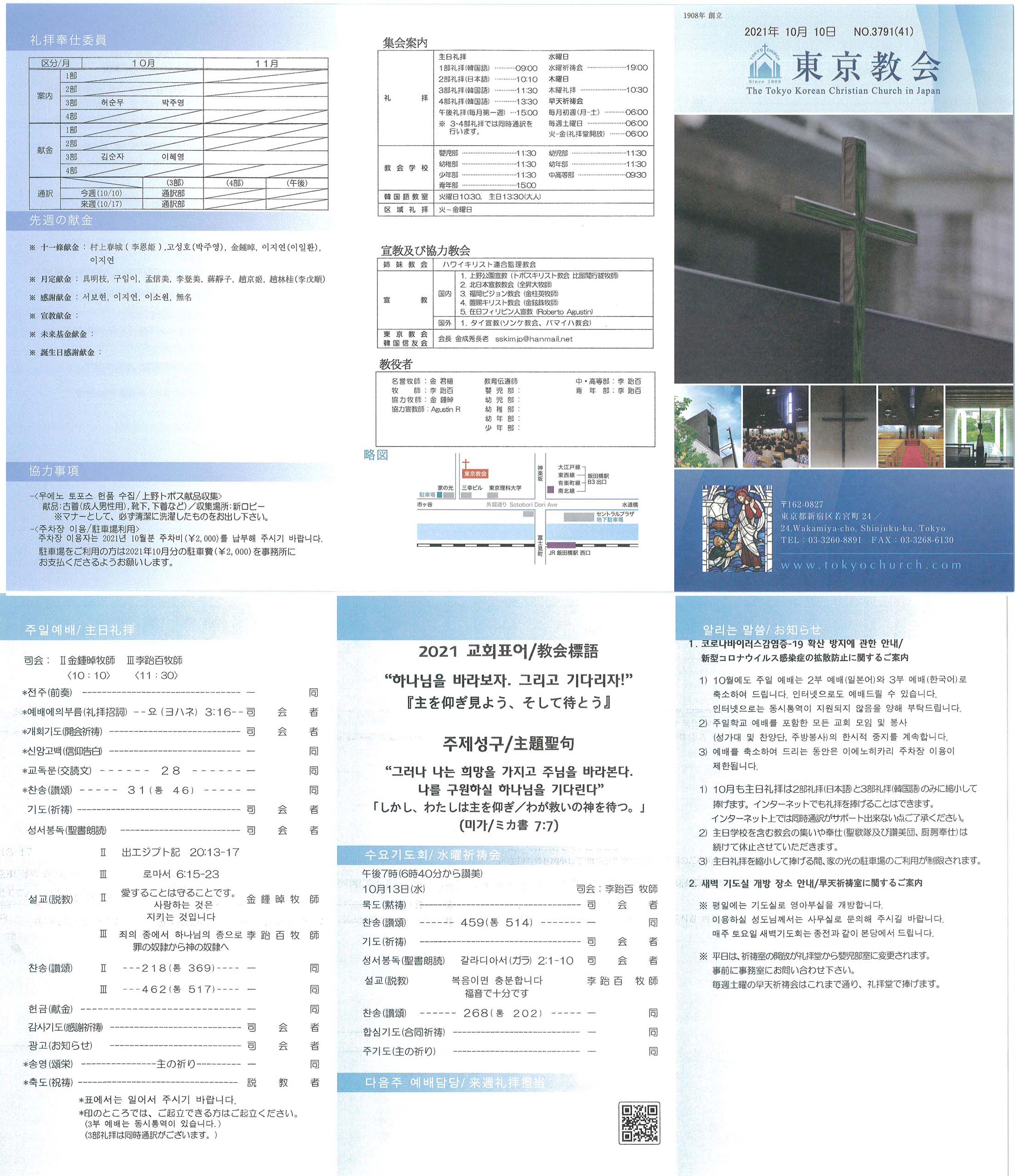 1) 10월에도 주일 예배는 2부 예배(일본어)와 3부 예배(한국어)로 축소하여 드립니다. 인터넷으로도 예배드릴 수 있습니다. 인터넷으로는 동시통역이 지원되지 않음을 양해 부탁드립니다.
