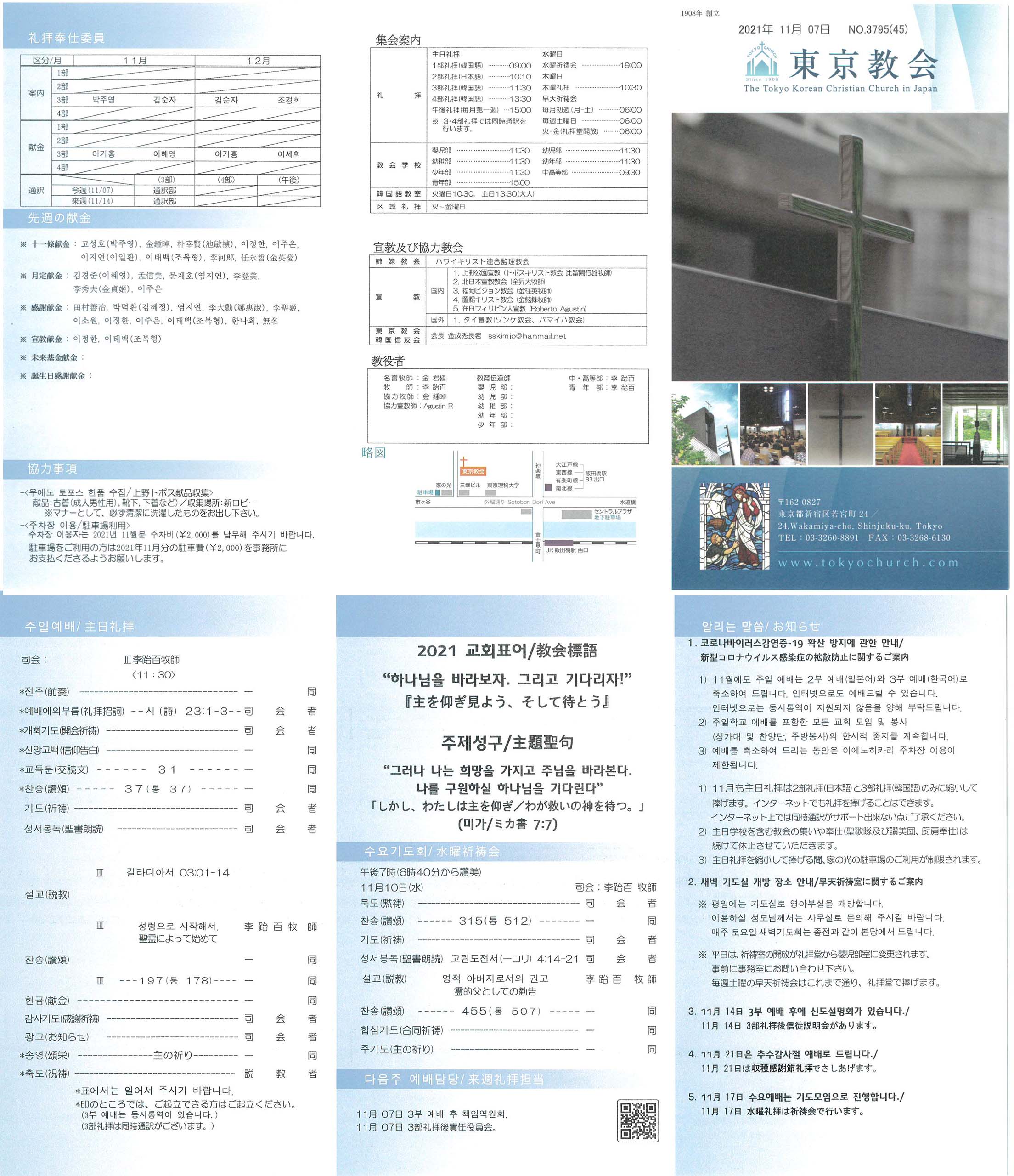 1) 11월에도 주일 예배는 2부 예배(일본어)와 3부 예배(한국어)로 축소하여 드립니다. 인터넷으로도 예배드릴 수 있습니다. 인터넷으로는 동시통역이 지원되지 않음을 양해 부탁드립니다.