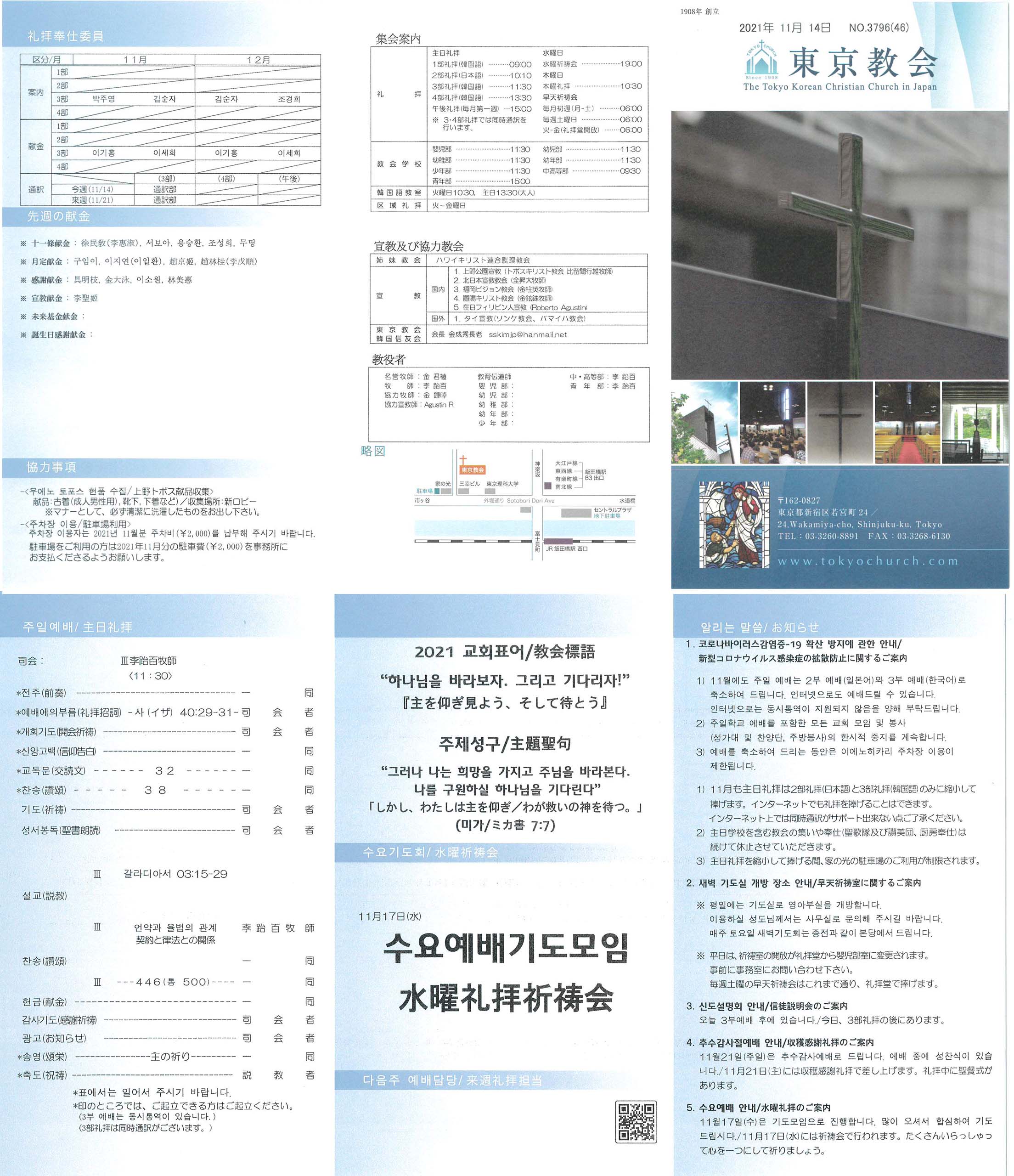 1) 11월에도 주일 예배는 2부 예배(일본어)와 3부 예배(한국어)로 축소하여 드립니다. 인터넷으로도 예배드릴 수 있습니다. 인터넷으로는 동시통역이 지원되지 않음을 양해 부탁드립니다.