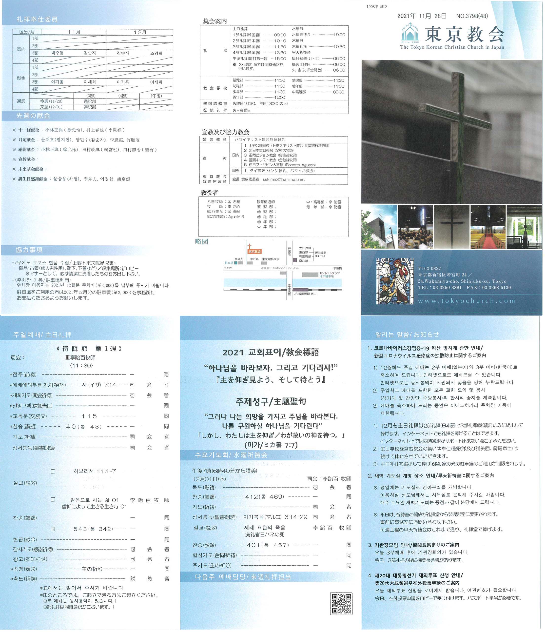 1) 12월에도 주일 예배는 2부 예배(일본어)와 3부 예배(한국어)로 축소하여 드립니다. 인터넷으로도 예배드릴 수 있습니다. 인터넷으로는 동시통역이 지원되지 않음을 양해 부탁드립니다.