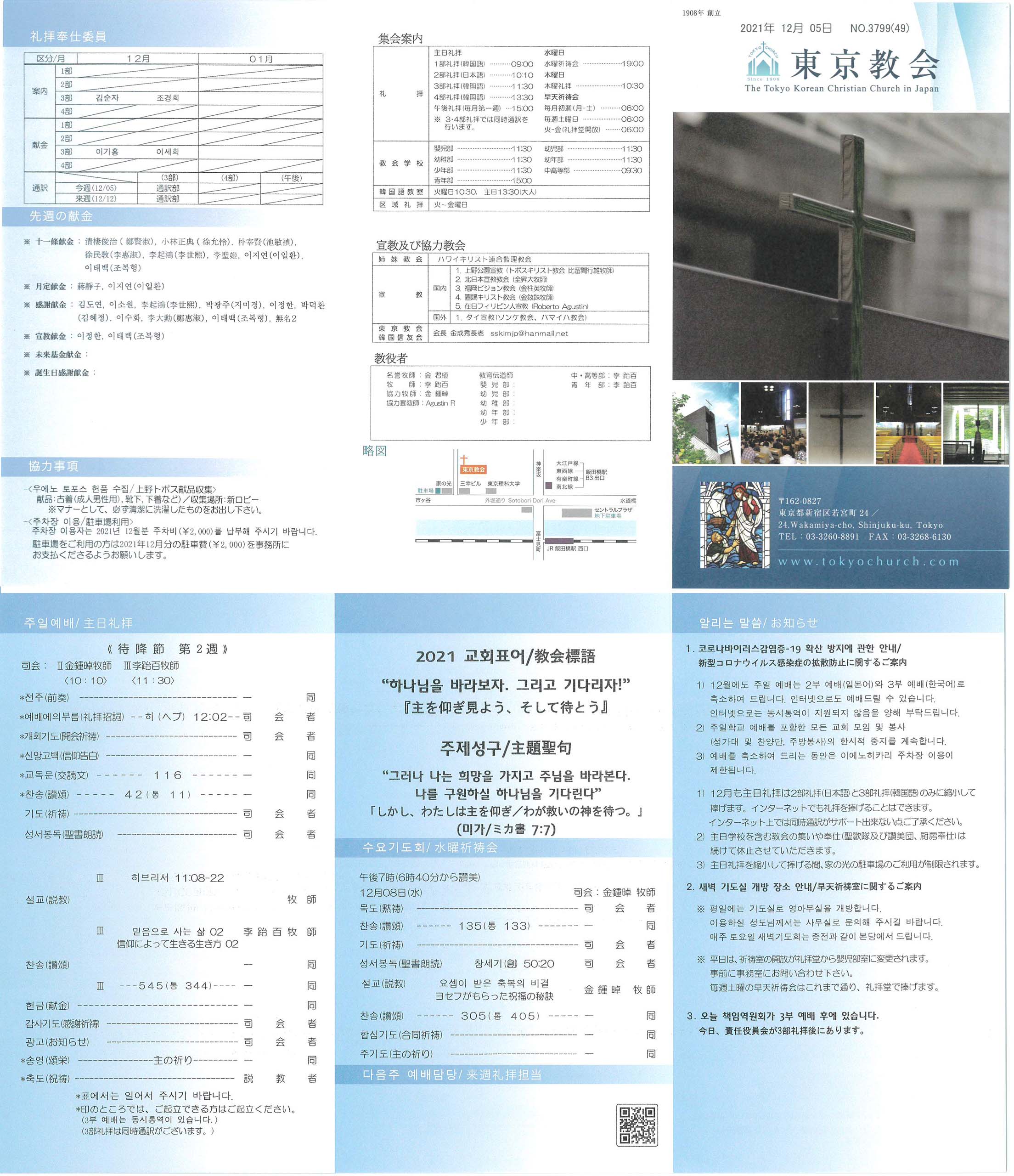 1) 12월에도 주일 예배는 2부 예배(일본어)와 3부 예배(한국어)로 축소하여 드립니다. 인터넷으로도 예배드릴 수 있습니다. 인터넷으로는 동시통역이 지원되지 않음을 양해 부탁드립니다.