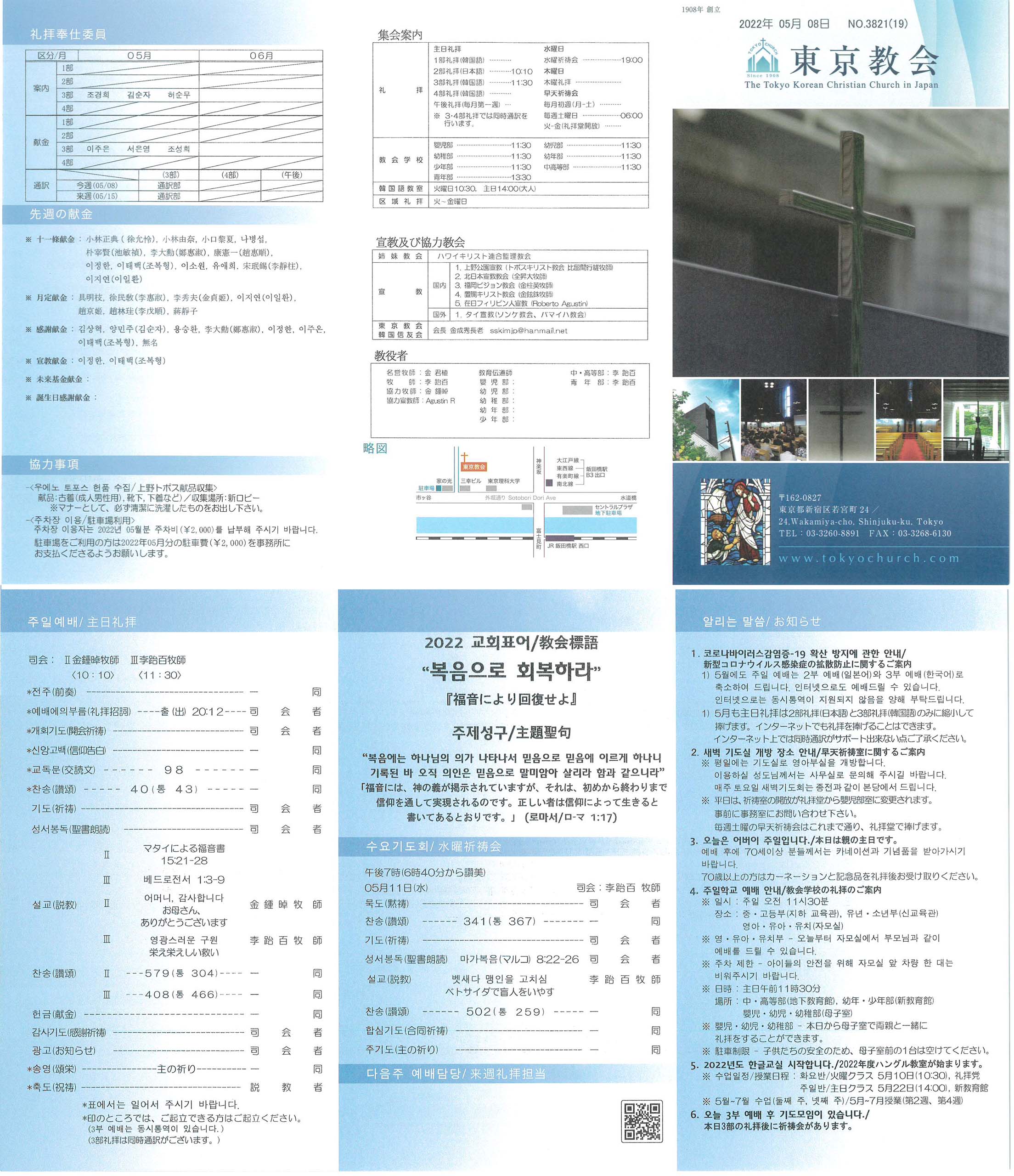 1) 5월에도 주일 예배는 2부 예배(일본어)와 3부 예배(한국어)로 축소하여 드립니다. 인터넷으로도 예배드릴 수 있습니다. 인터넷으로는 동시통역이 지원되지 않음을 양해 부탁드립니다.