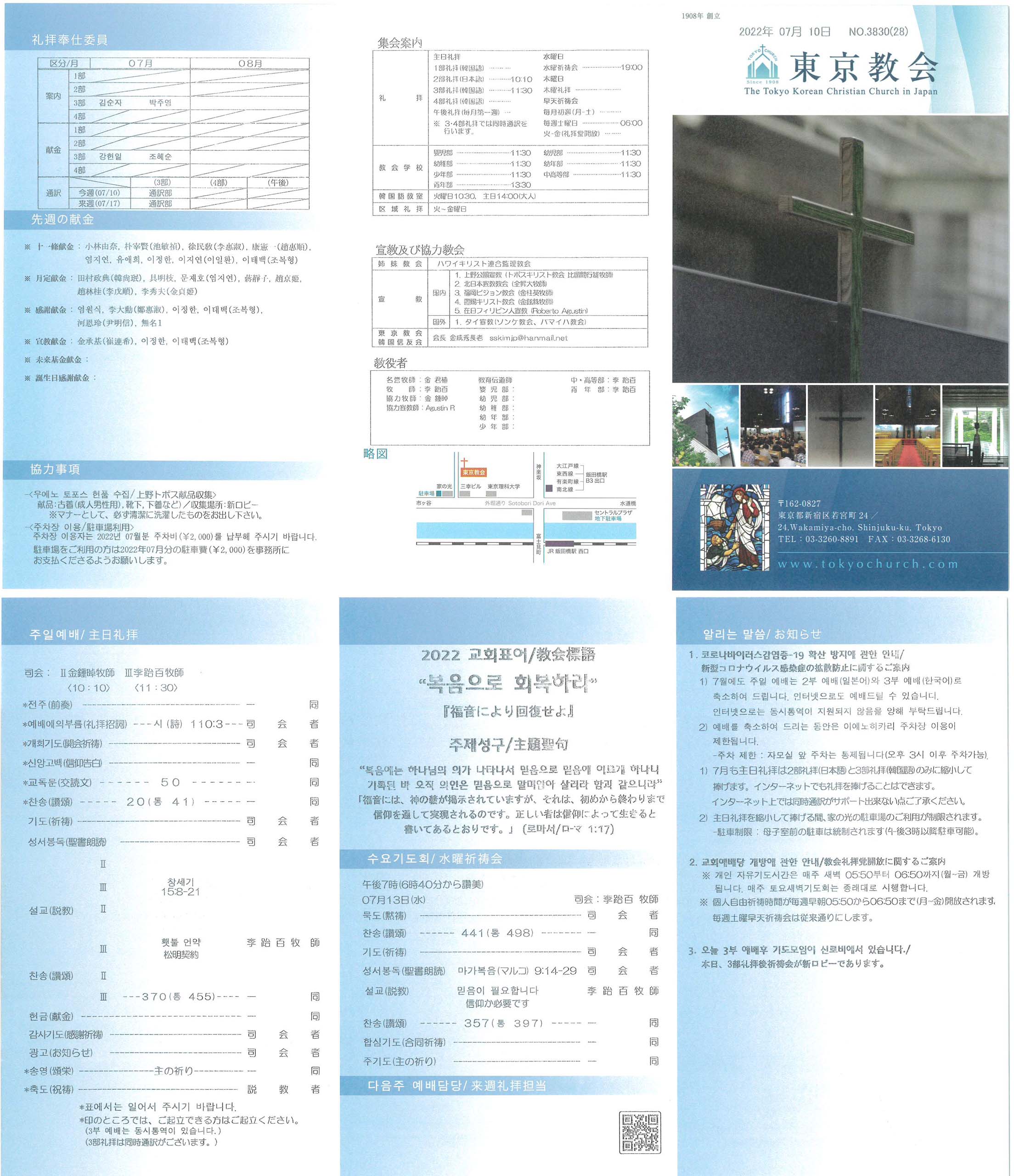 1. 코로나바이러스감염증-19 확산 방지에 관한 안내 1) 7월에도 주일 예배는 2부 예배(일본어)와 3부 예배(한국어)로 축소하여 드립니다. 인터넷으로도 예배드릴 수 있습니다. 인터넷으로는 동시통역이 지원되지 않음을 양해 부탁드립니다.