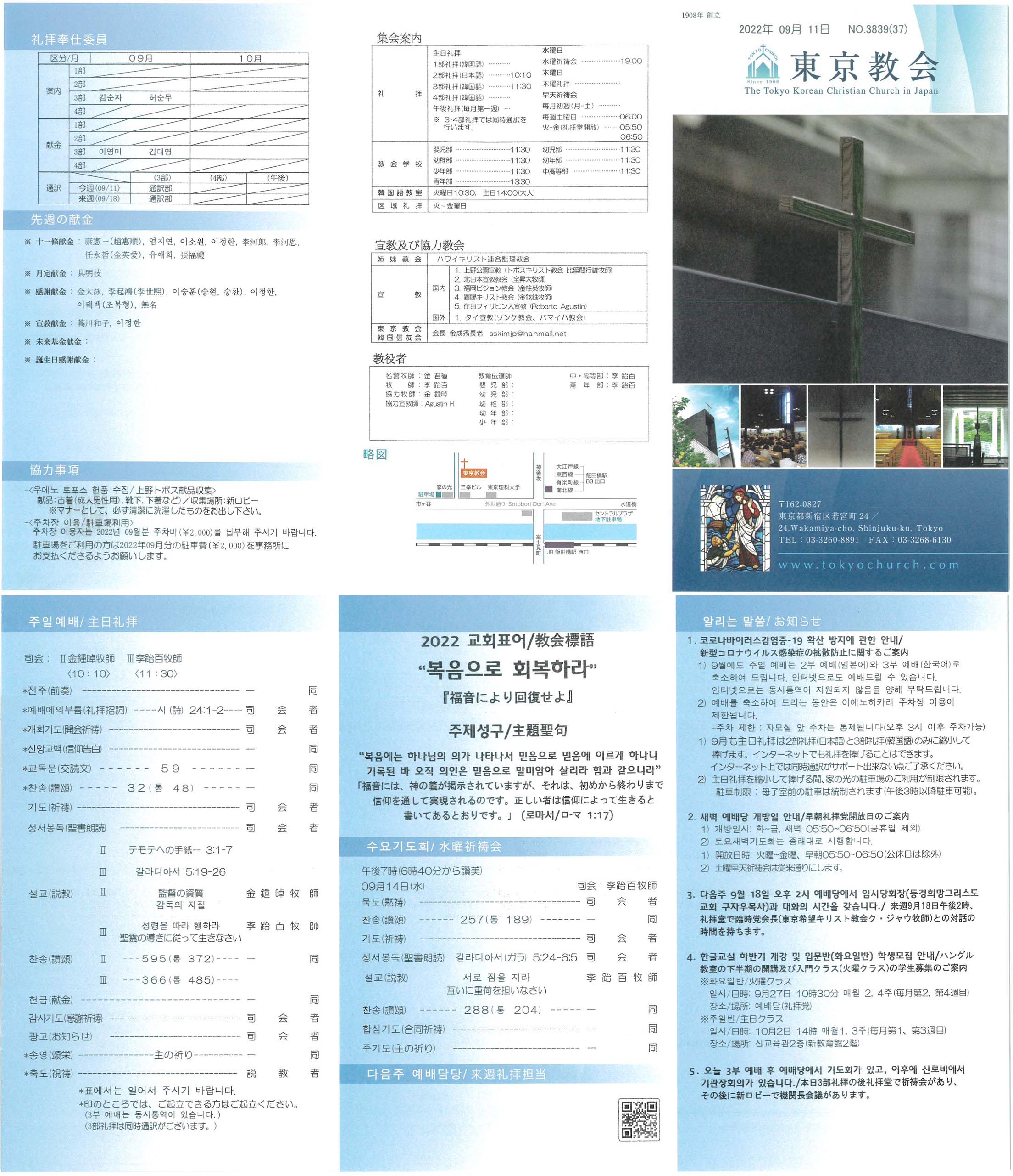1) 9월에도 주일 예배는 2부 예배(일본어)와 3부 예배(한국어)로 축소하여 드립니다. 인터넷으로도 예배드릴 수 있습니다. 인터넷으로는 동시통역이 지원되지 않음을 양해 부탁드립니다.