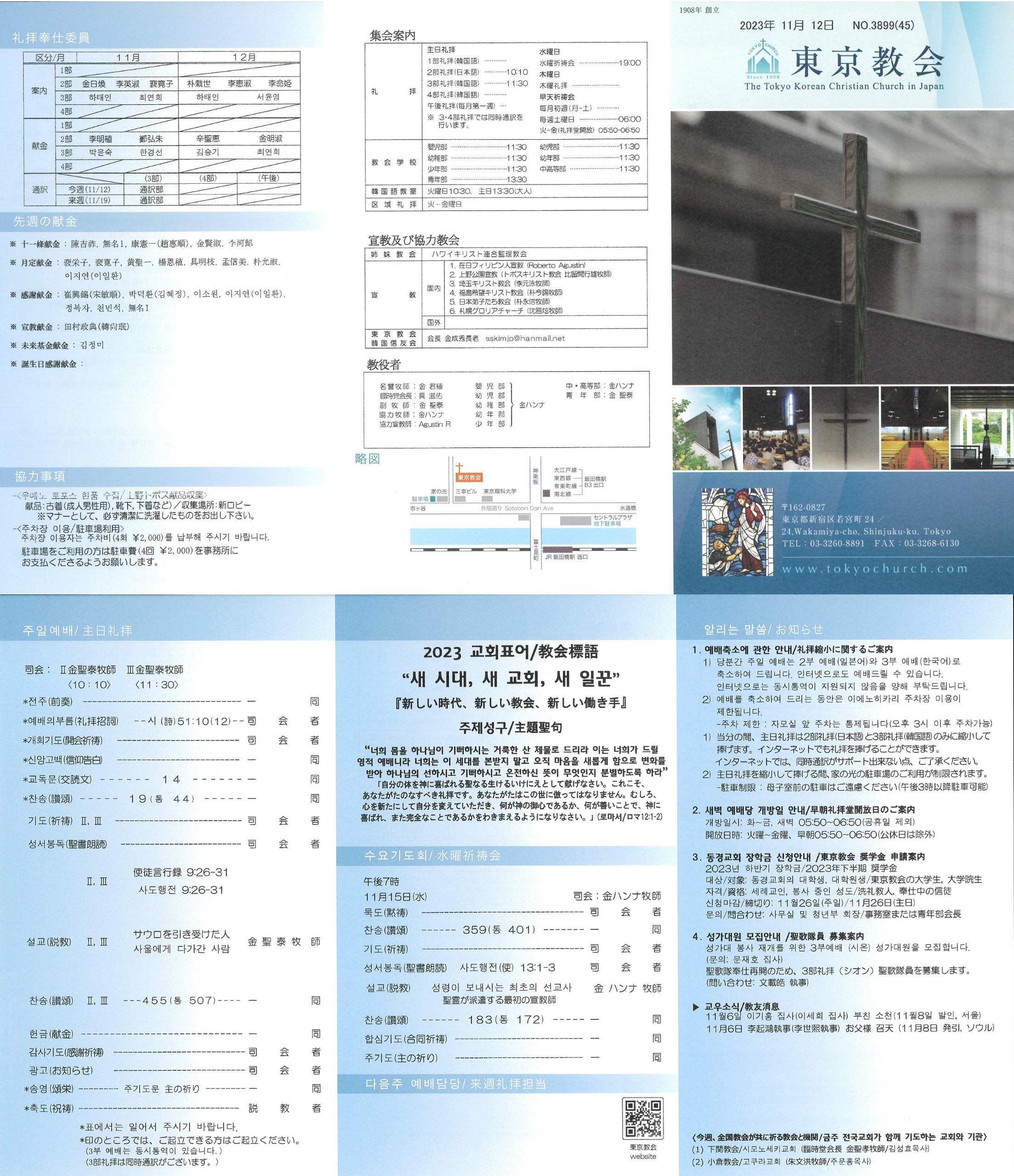 1) 당분간 주일 예배는 2부 예배(일본어)와 3부 예배(한국어)로 축소하여 드립니다. 인터넷으로도 예배드릴 수 있습니다. 인터넷으로는 동시통역이 지원되지 않음을 양해 부탁드립니다.