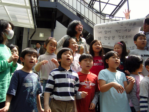 예배후 정문앞에서 열심히 찬양하는