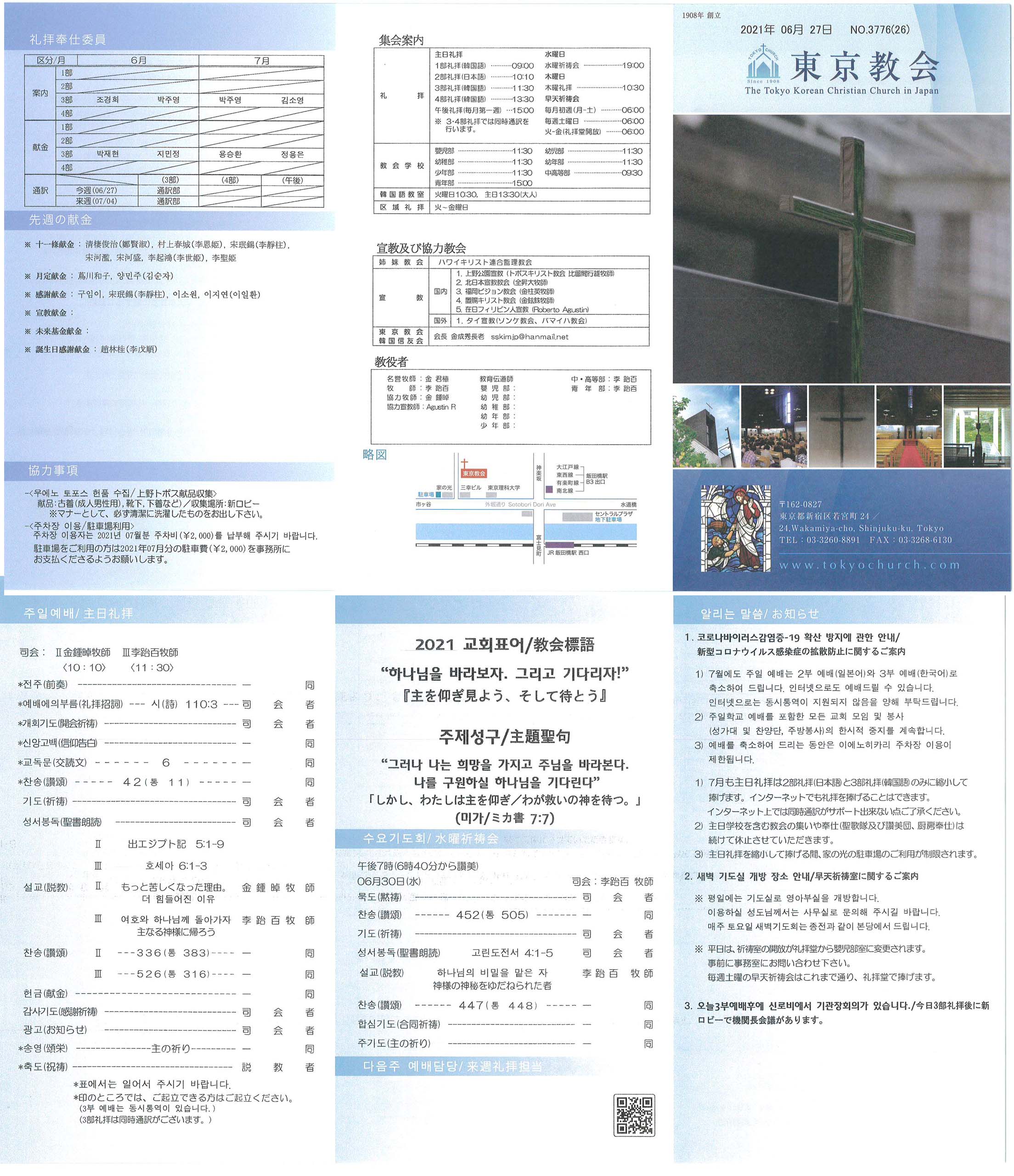 1) 7월에도 주일 예배는 2부 예배(일본어)와 3부 예배(한국어)로 축소하여 드립니다. 인터넷으로도 예배드릴 수 있습니다. 인터넷으로는 동시통역이 지원되지 않음을 양해 부탁드립니다.
