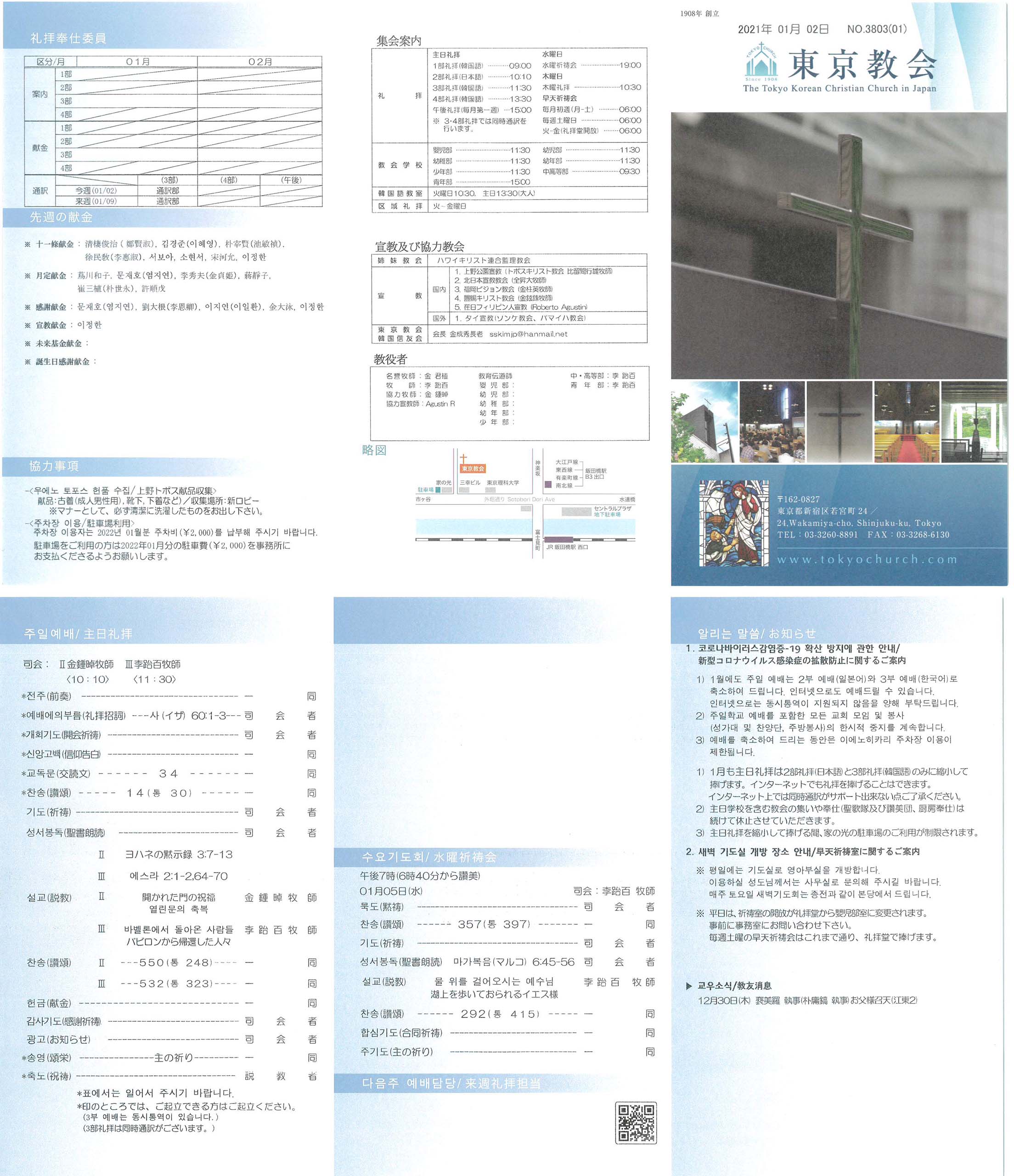 1) 1월에도 주일 예배는 2부 예배(일본어)와 3부 예배(한국어)로 축소하여 드립니다. 인터넷으로도 예배드릴 수 있습니다. 인터넷으로는 동시통역이 지원되지 않음을 양해 부탁드립니다.