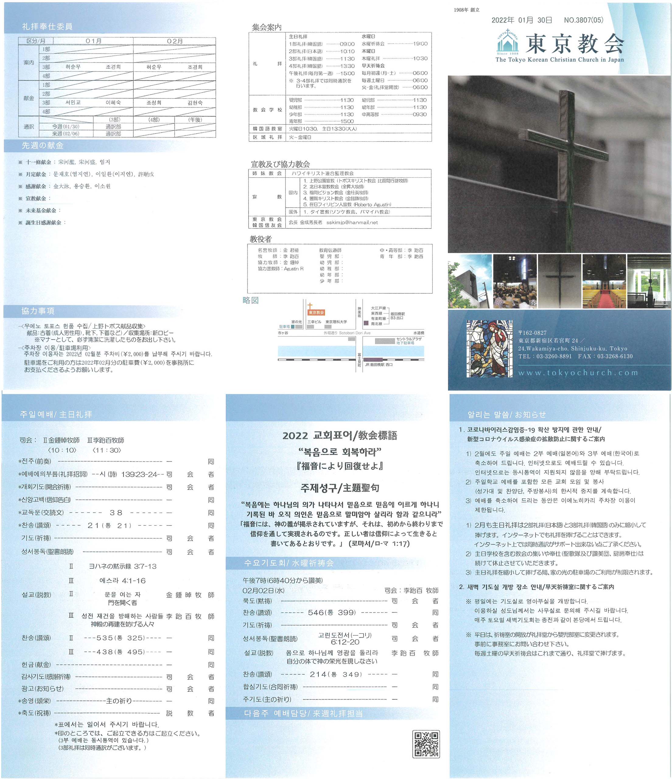 1) 2월에도 주일 예배는 2부 예배(일본어)와 3부 예배(한국어)로 축소하여 드립니다. 인터넷으로도 예배드릴 수 있습니다. 인터넷으로는 동시통역이 지원되지 않음을 양해 부탁드립니다.