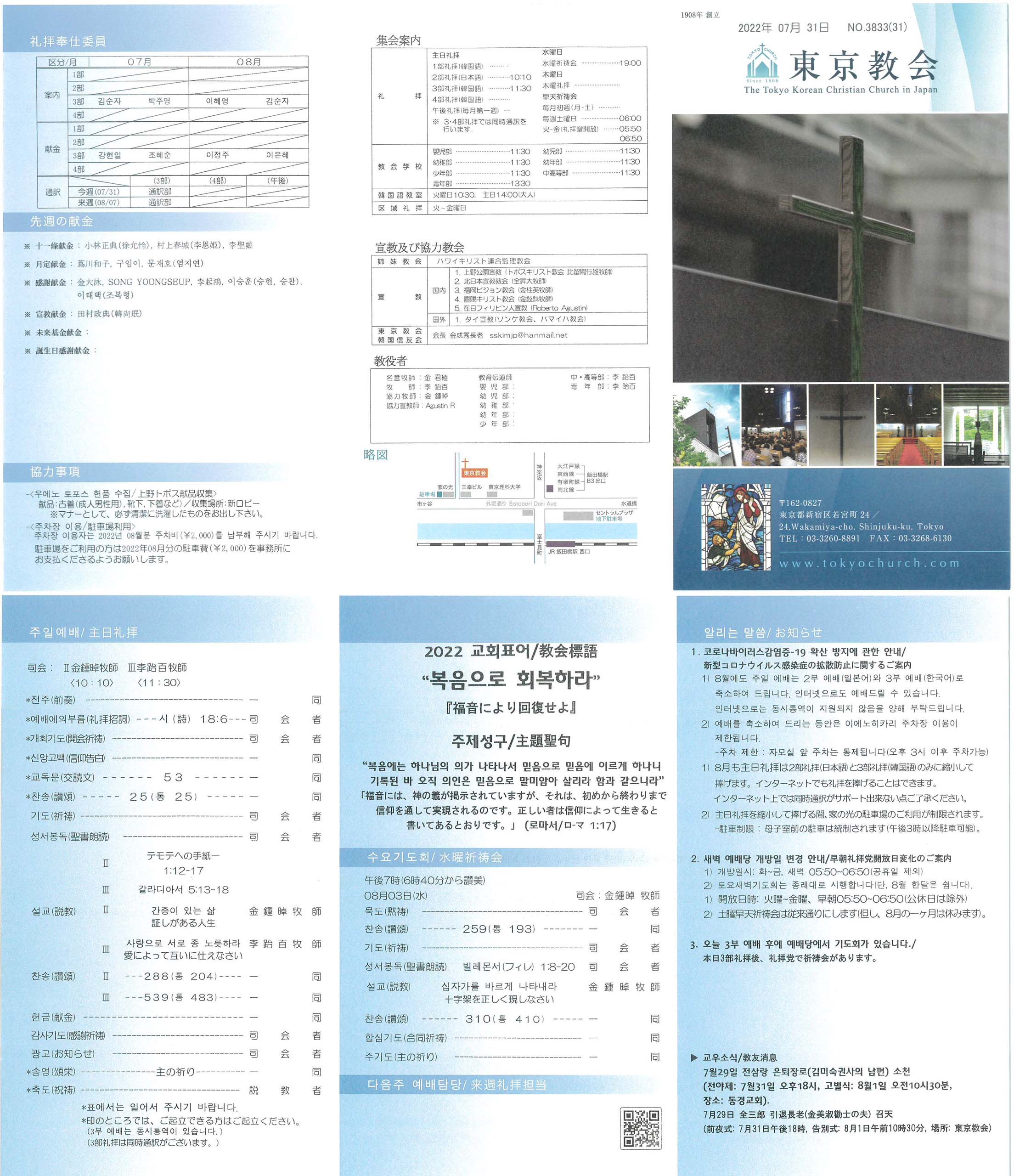 1) 8월에도 주일 예배는 2부 예배(일본어)와 3부 예배(한국어)로 축소하여 드립니다. 인터넷으로도 예배드릴 수 있습니다. 인터넷으로는 동시통역이 지원되지 않음을 양해 부탁드립니다.