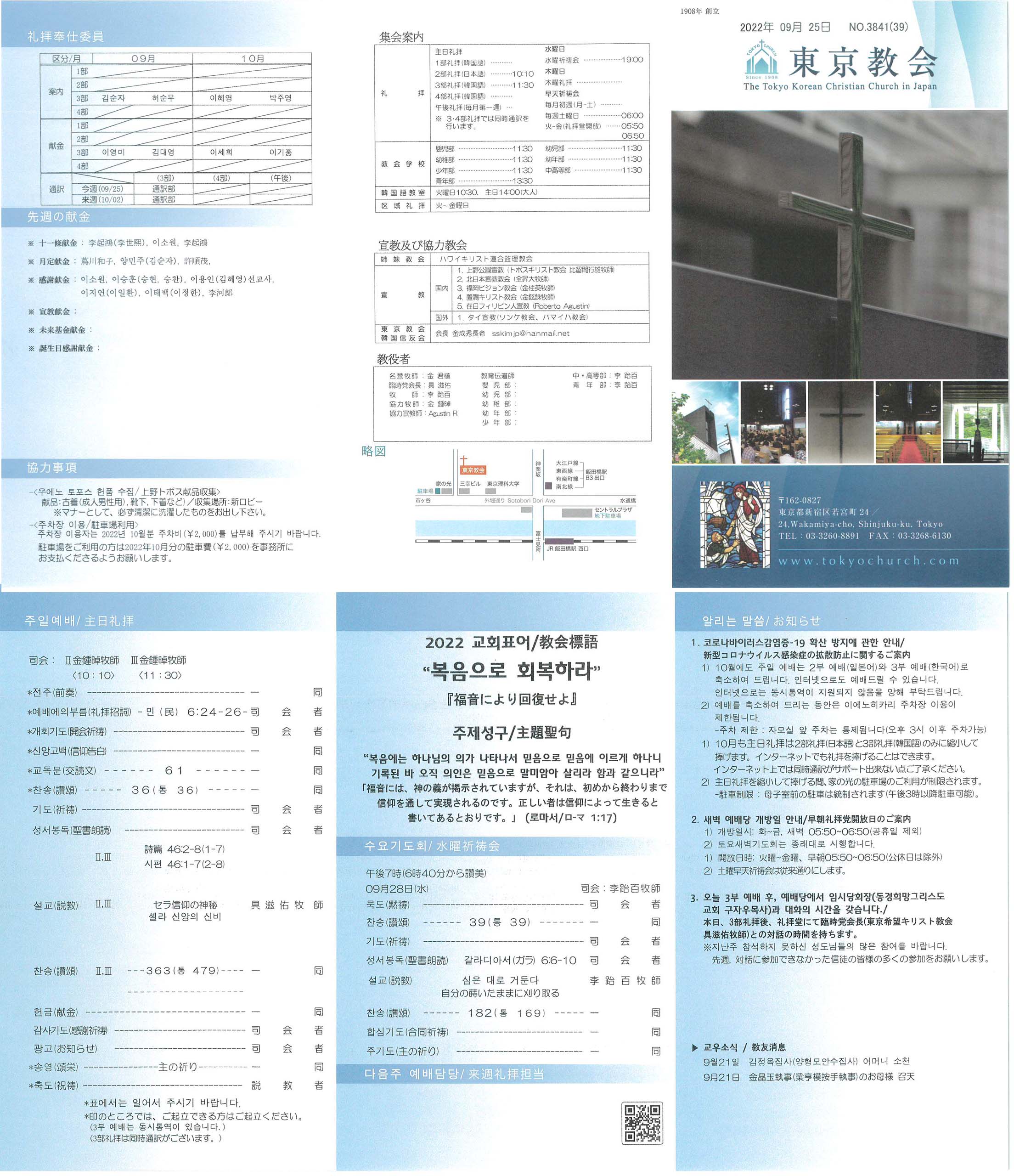 1. 코로나바이러스감염증-19 확산 방지에 관한 안내1) 10월에도 주일 예배는 2부 예배(일본어)와 3부 예배(한국어)로 축소하여 드립니다. 인터넷으로도 예배드릴 수 있습니다. 인터넷으로는 동시통역이 지원되지 않음을 양해 부탁드립니다.