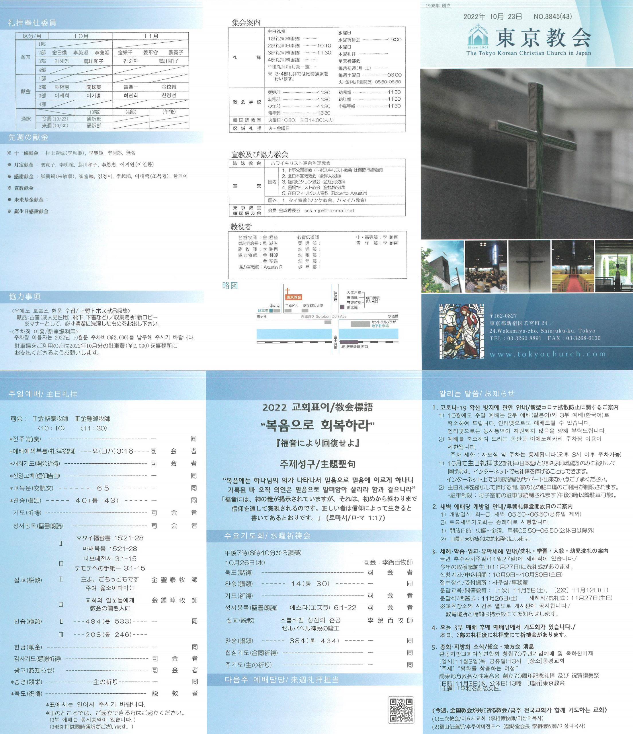 1) 10월에도 주일 예배는 2부 예배(일본어)와 3부 예배(한국어)로 축소하여 드립니다. 인터넷으로도 예배드릴 수 있습니다. 인터넷으로는 동시통역이 지원되지 않음을 양해 부탁드립니다.