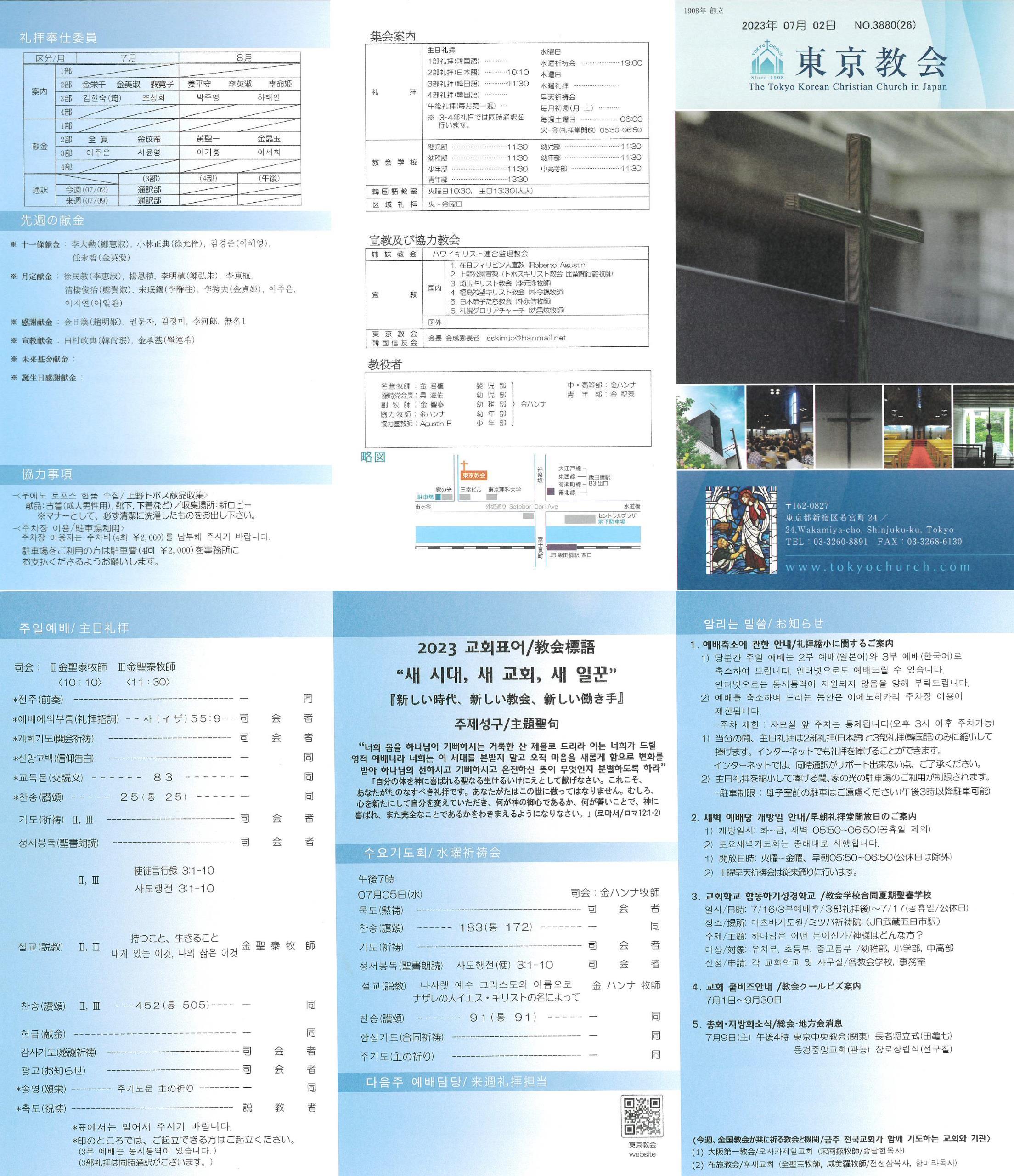 1) 당분간 주일 예배는 2부 예배(일본어)와 3부 예배(한국어)로 축소하여 드립니다. 인터넷으로도 예배드릴 수 있습니다. 인터넷으로는 동시통역이 지원되지 않음을 양해 부탁드립니다.