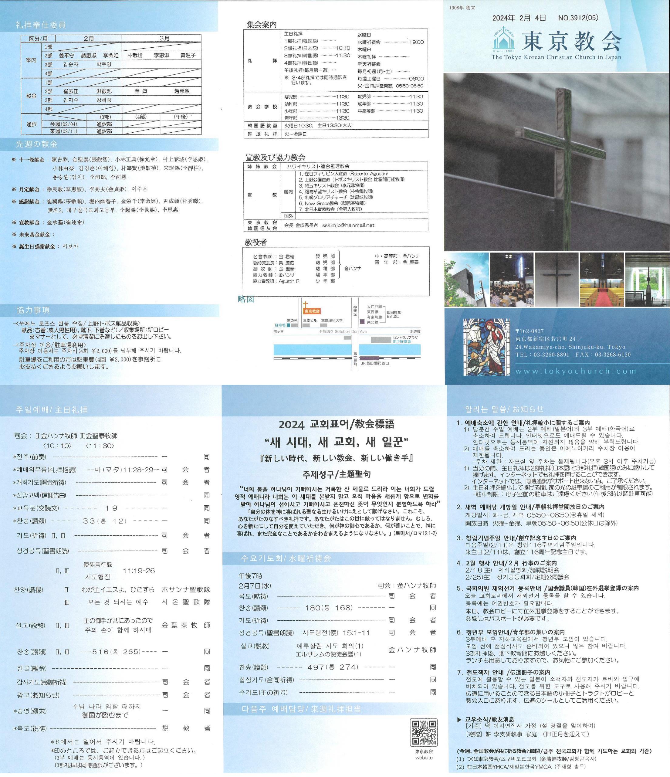 1) 당분간 주일 예배는 2부 예배(일본어)와 3부 예배(한국어)로 축소하여 드립니다. 인터넷으로도 예배드릴 수 있습니다. 인터넷으로는 동시통역이 지원되지 않음을 양해 부탁드립니다.